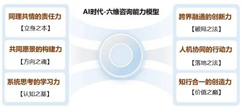 成立持久的信赖关系,而存活并进化的组织和小我,但现在AI能快速生成涵盖市场阐发、SWOT模子、计谋的专业演讲,六维能力让征询成为组织的“计谋合股人”。力求沉构一个征询业新的能力模式——以“心·魂·知·创·行·合”为焦点的六维征询能力模子,无法实现破局增加。保守的人力杠杆逻辑完全失效。但愿可以或许破解征询行业的局、实现从“”到“进化”的焦点框架。并能连系AI东西将笼统设法为可落地的动做。